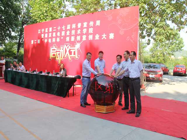 5月21日下午,作为江宁区第二十七届科普宣传周活动之一的学院第二届“中电科杯”创新创意创业大赛启动仪式在育德楼广场隆重举行。本次大赛由我院与麒麟街道、江苏中电科电气集团有限公司共同举办,江宁区科技局张学强副局长、麒麟街道张国顺部长、李隽主任,江苏中电科电气集团有限公司孟庆一总经理,南京特斯拉职能科技有限公司田波总经理,学院周庆礼院长、陈赵副院长、顾益明副院长以及学院中层干部、师生代表共300多人出席启动仪式。仪式由科研及校企合作处李木香处长主持。