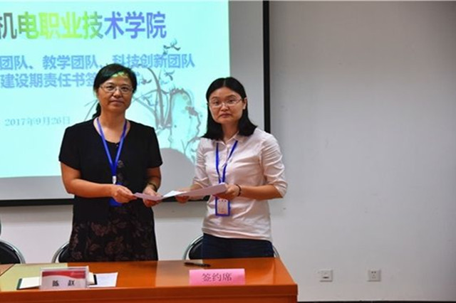 9月26日下午,学院举行首批专业核心团队、教学团队、科技创新团队建设期责任书签订仪式。党委书记、院长周庆礼,党委副书记、常务副院长顾益明,纪委书记、副院长陈赵,党委委员、副院长刁爱军,各系系主任、人事处、教务处、科研及校企合作处的部门领导以及“三支团队”的负责人、团队成员出席仪式。仪式由人事处处长夏玲玲主持。