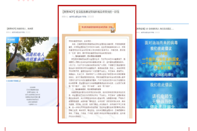 1、师生覆盖率100%。从春节前夕开始,在疫情防控期间学院官微、学工微信同步推送相关推文,受众涵盖了全体教职员工,在校生、学生家长、毕业校友等14000余人。认真收集、整理权威平台疫情日报相关数据,防控指南、科学知识在学院现有的各宣传平台及时发布,将学院最新的防疫精神、建议指南传达给每位师生,建立了院、系(部门)、班级三级宣传体系,确保师生人人看到。先后发布了《致全体南机电师生的一封信》、《球友会在线工会关于抗击新型肺炎疫情的倡议书》、《致全院各基层党组织和全体党员的一封信》等针对不同对象的推文,扩大了覆盖面,提高了知晓率。