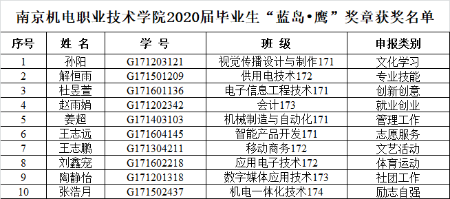 根据《球友会在线关于开展2020届毕业生“蓝岛•鹰”奖章评选推荐工作的通知》,经系部评审小组初步审核,学工处复核,专家评审组评审,决定拟推荐以下10名同学为2020届毕业生“蓝岛•鹰”奖章获得者。现予以公示,公示时间:2020年7月2日—2020年7月6日。联系人:宁燕,电话:025-84190262。
