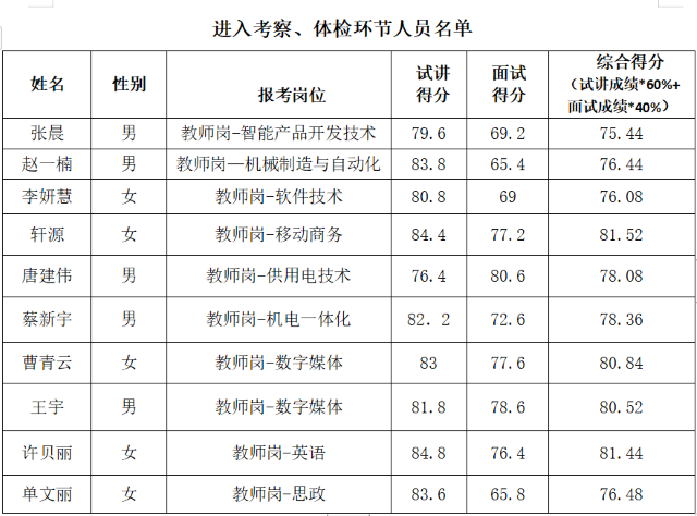 根据《球友会在线2020年教师、辅导员公开招聘笔试、试讲及面试考核公告》,经过资格审查和考核等环节,并经学院公开招聘领导小组和党委会研究,现将各招聘岗位进入考察、体检环节的人员名单予以公示,公示时间为五个工作日(2020年8月17日—2020年8月21日)。如有异议请在公示期内向我院人事处或纪委办公室反映。