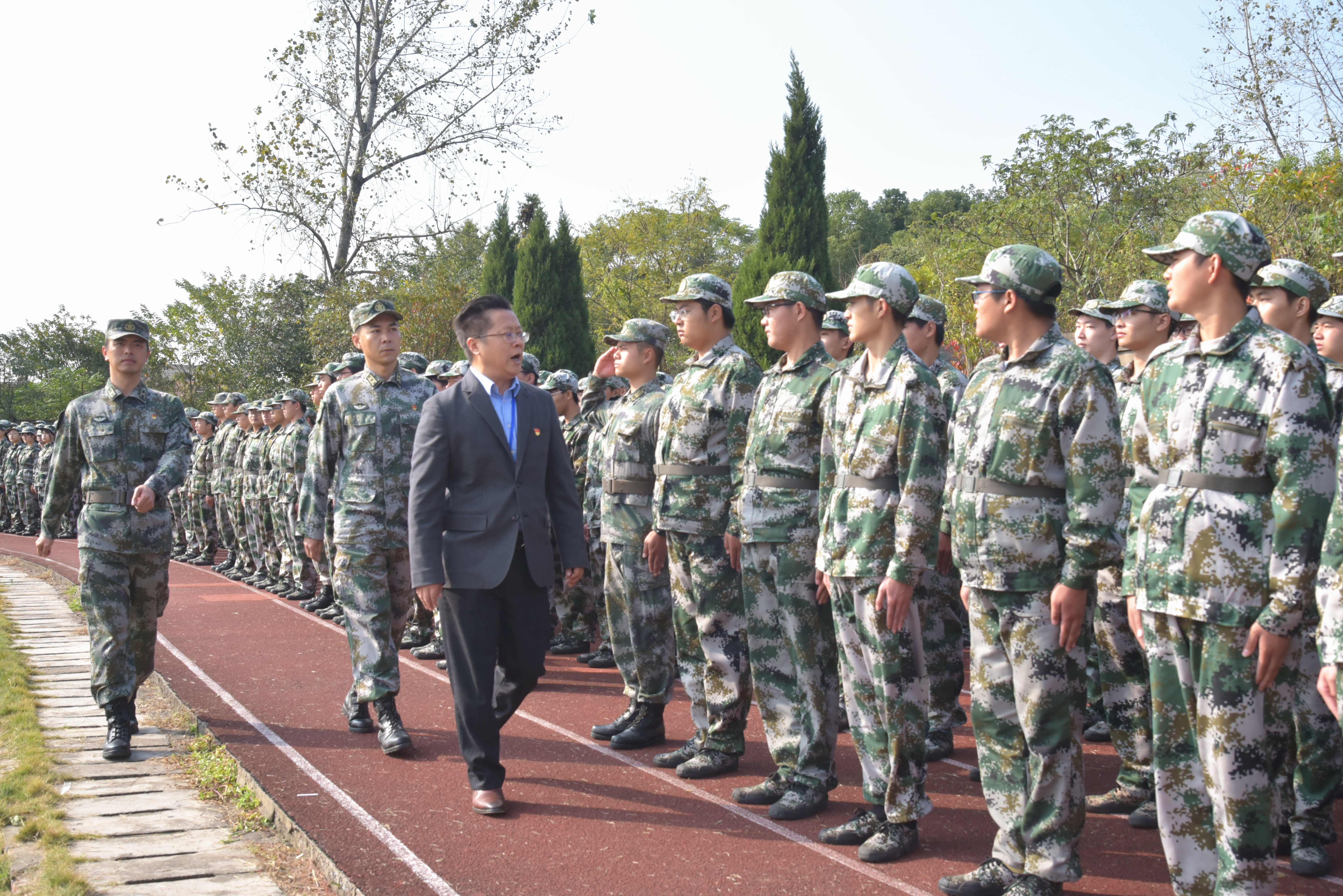 大会开始,周院长在方震中校的陪同下对各个训练方阵进行检阅,全体学员军姿挺拔,精神抖擞,展现了良好的军事素质和精神风貌。