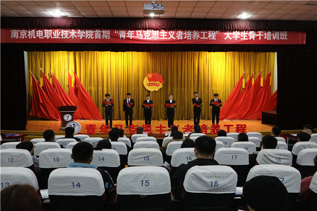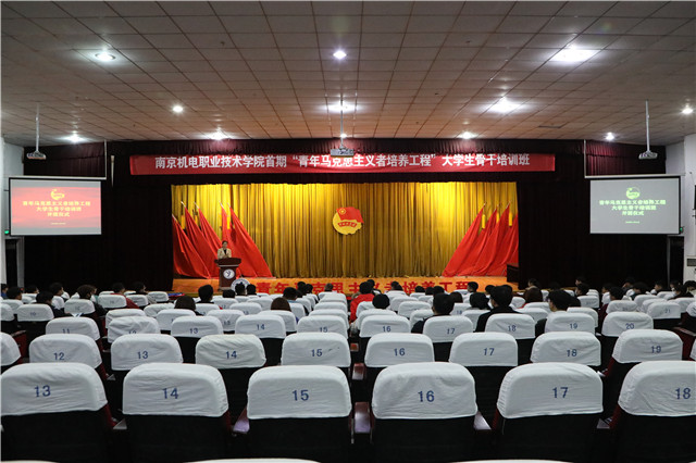 为深入贯彻落实习近平新时代中国特色社会主义思想和党的十九大精神以及《中长期青年发展规划(2016-2025)》《高校思想政治工作质量提升工程实施纲要》《“青年马克思主义者培养工程”实施纲要》等文件精神,推进“青年马克思主义者培养工程”的实施,改进创新面向广大青年学生的思想引领工作方式,着力培养新时代“爱国、励志、求真、力行”的社会主义合格建设者和可靠接班人,依照共青团“凝聚青年、服务大局、当好桥梁、从严治团”的工作格局,在广大青年中着力培养、造就一批经由马克思主义中国化的最新成果武装的年轻学生干部,使他们努力成为共产主义远大理想的坚定信仰者、社会和谐的积极促进者,南京机电职业技术学院首期“青年马克思主义者培养工程”大学生骨干培训班于2020年11月25日晚在报告厅顺利开班,并举行首场报告。球友会在线党委委员、副院长赵学洪,纪委副书记、党委工作部部长周启国,学生工作处处长张宝中,党委工作部副部长张玥出席活动。学院各系部团总支书记、青马班各小组指导老师、学生干部骨干、青马班全体成员等80余人参加开班仪式。团委书记唐钰峤主持本次活动。