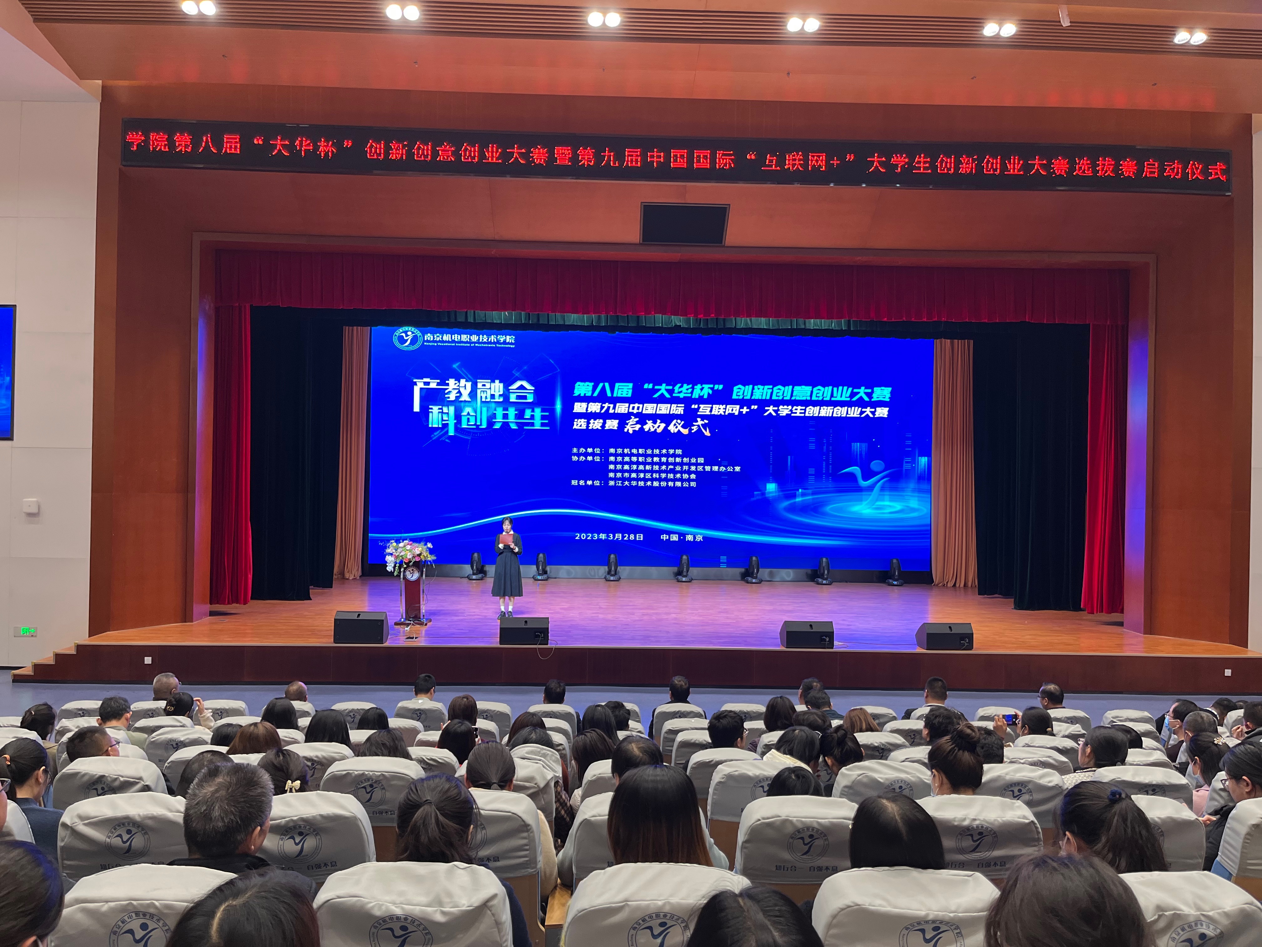 3月28日下午,学校第八届“大华杯”创新创意创业大赛暨第九届中国国际“互联网+”大学生创新创业大赛选拔赛启动仪式在青春剧场成功举办。南京高等职业教育创新创业园党工委委员、管委会副主任汪春荣,南京高淳高新技术产业开发区管理办公室分管负责人倪友谊,南京市高淳区科学技术协会副主席杨腊斌,浙江大华技术股份有限公司南京分公司总经理杨杰、南京办高溧组主任高国平,球友会在线党委委员、副院长郭朝辉,党委委员、副院长赵学洪,党委委员、副院长刁爱军,党委委员、副院长孔德丽,党委委员、工会主席姜振宇出席启动仪式。学校全体师生参与活动。
