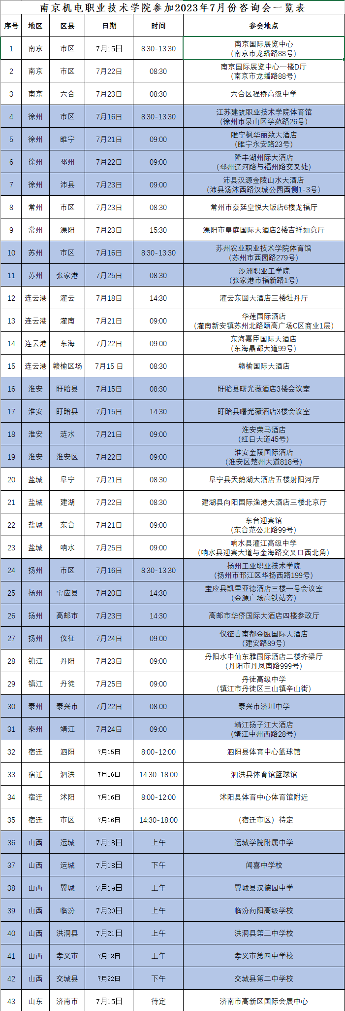 为帮助广大考生熟悉了解我校2023年高考招生政策,更好的为考生和家长做好志愿指导服务。我校教师将于7月份奔赴省内外各地,面对面与考生和家长进行交流。具体参会场次如下: