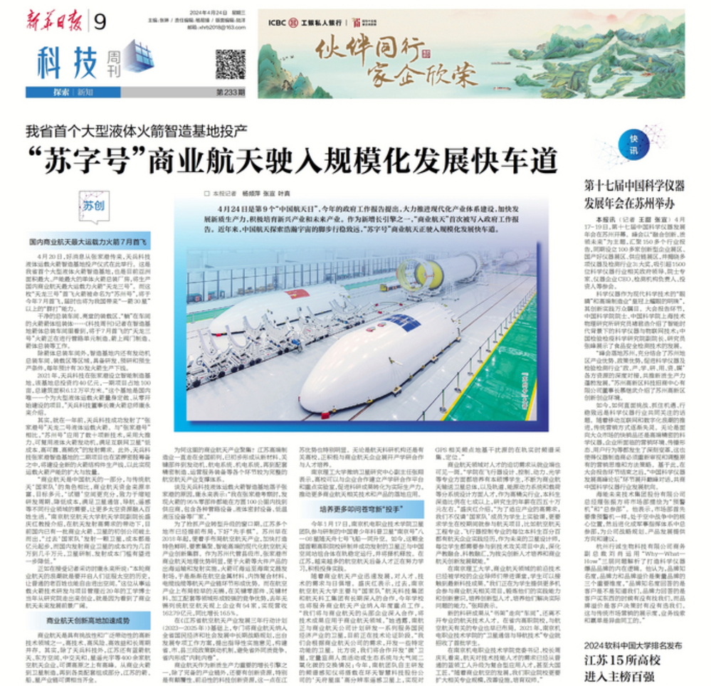 4月24日是第9个“中国航天日”,今年的政府工作报告提出,大力推进现代化产业体系建设,加快发展新质生产力,积极培育新兴产业和未来产业。作为新增长引擎之一,“商业航天”首次被写入政府工作报告。近年来,中国航天探索浩瀚宇宙的脚步行稳致远,“苏字号”商业航天正驶入规模化发展快车道。