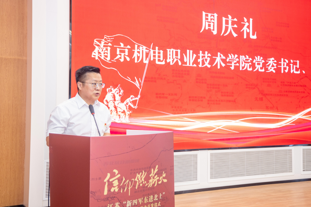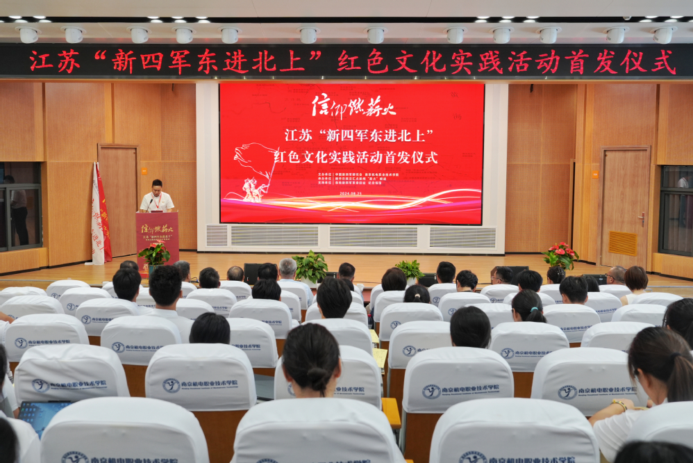 8月25日,我校在乐学楼报告厅举办了江苏“新四军东进北上”红色文化实践活动首发仪式。中国新四军研究会副会长刘春灏,中国新四军研究会学术委员会主任常浩如,中共江苏省委党史工作办公室副主任吴逵隆,新华日报社党委委员、副总编辑钱丽萍,中共江苏省委宣传部宣教处处长张广宇,江苏省文化和旅游厅革命文物处处长刘旭东,江苏省退役军人事务厅拥军褒扬处处长张苇苇,江苏省档案馆资源开发处副处长朱芳芳,南京理工大学马克思主义学院党委副书记、纪委书记徐彦秋,江苏省文化艺术科学技术协会副秘书长夏军,茅山新四军纪念馆副馆长杨玉秀,新四军江南指挥部纪念馆行政部副主任刘亚平,球友会在线党委书记、校长周庆礼,党委副书记、副校长赵学洪,纪委副书记、纪委办公室主任周启国出席,我校思政中心教师、网络思政中心站长和“三下乡”大学生社会实践团铁军训练营师生参加。仪式由球友会在线党委委员、副校长孔德丽主持。