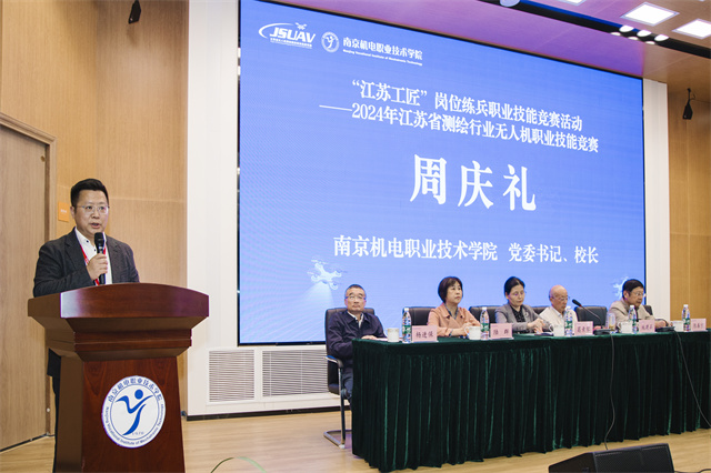 周庆礼向大赛致辞,他结合新质生产力发展要求为我们介绍了学校在无人机专业发展方面取得的成绩,以及对本次比赛的美好祝愿。