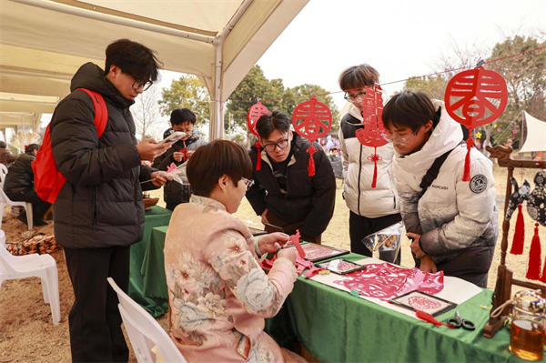 现场特色非遗展演,吸引了学生和群众共同参与,当地非遗传承人现场展示剪纸、锡器雕刻、糖画等传统技艺。研学师生、群众与非遗传承人互动,亲手体验剪纸技艺,感受传统工艺的魅力。