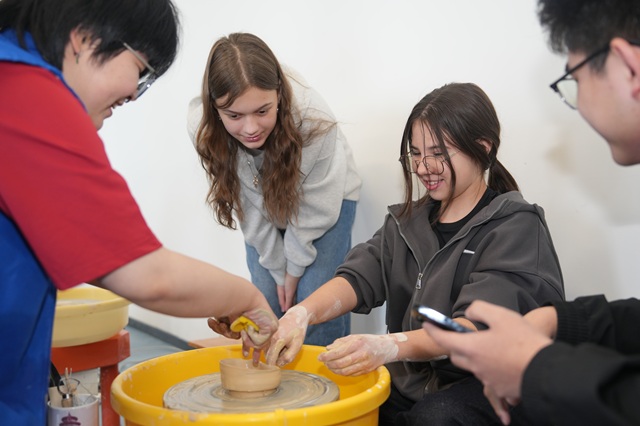 会后,代表团一行参观了学校的蓝岛陶艺工坊,激光切割工坊,热转印工坊。在讲师的生动讲解和演示下,代表团成员兴致勃勃地参与现场体验和互动交流,对学校跨学科融合教学场景及实践成果表示由衷赞叹。
