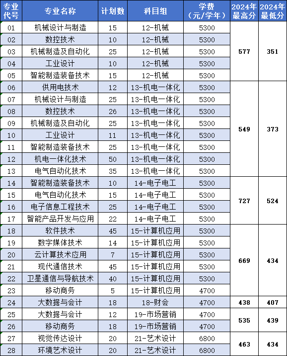 我校2025年职教高考专科第一批次拟投放招生计划600人,涉及机械、机电一体化、电子电工、计算机应用、财会、市场营销和艺术设计7个科目组19个专业,最终计划数以省考试院公布为准!