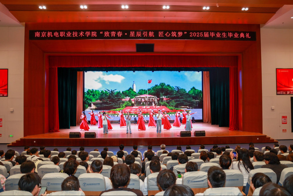 歌伴舞《如愿》以诗意表达传递祝福,毕业生集体宣誓环节铿锵有力,“请党放心,强国有我” 的誓言响彻会场。