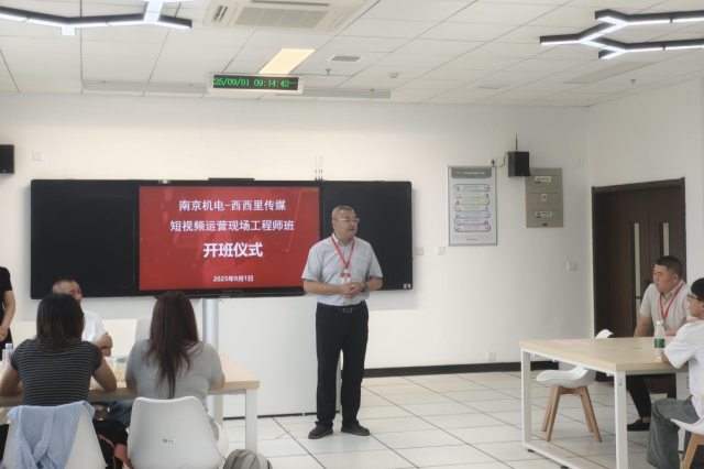 2025年9月1日,球友会在线与南京西西里文化传媒有限公司隆重举行短视频运营现场工程师班开班仪式,标志着双方在产教融合领域开启战略合作新篇章。仪式于我校弘毅楼207教室举行,与会嘉宾包括南京西西里文化传媒有限公司行政总监邢夏飞,运营总监陶钰莹,我校党委委员、副校长刁爱军,人文社科系主任曹安林,系党支部书记李杰,数字媒体技术专业负责人郝逸萱以及学工干事、班级辅导员梁娟娟,仪式由曹安林主持。