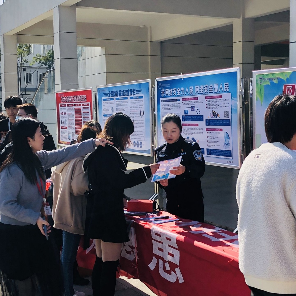 为加强安全宣传教育,提升在校大学生的安全意识,有效遏制校园各类安全隐患,11月9日上午,我校保卫处邀请高淳公安分局、高淳区反诈中心、高淳区古柏派出所走进校园开展“防范安全风险 打击电信诈骗”宣传活动。