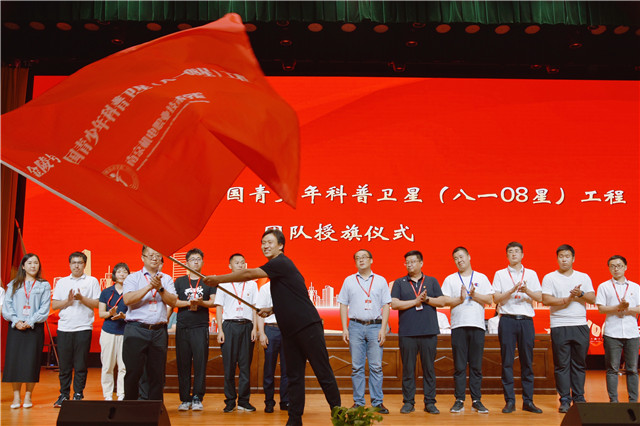 陈赵同志宣读《关于成立“金陵号”暨中国青少年科普卫星(八一08星)工程团队的决定》。周庆礼同志为工程团队授旗。