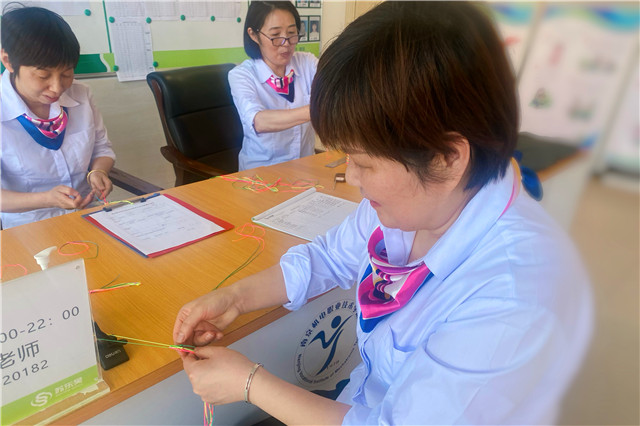 4月17日,五彩蛋袋编织活动在宿舍区开展,大管中心周长花老师准备了五颜六色的彩线,并为大家演示蛋袋的编织方法。听完讲解,宿管阿姨迫不及待地动起手来,先把不同颜色的线套在线圈上,分别对折并打上8组结,再将每组相连的两根彩线按约1厘米的长度进行编结,编完4圈后打结,很快宿管阿姨手中的彩线就变成了一个个五彩蛋袋,尽显传统文化的魅力。