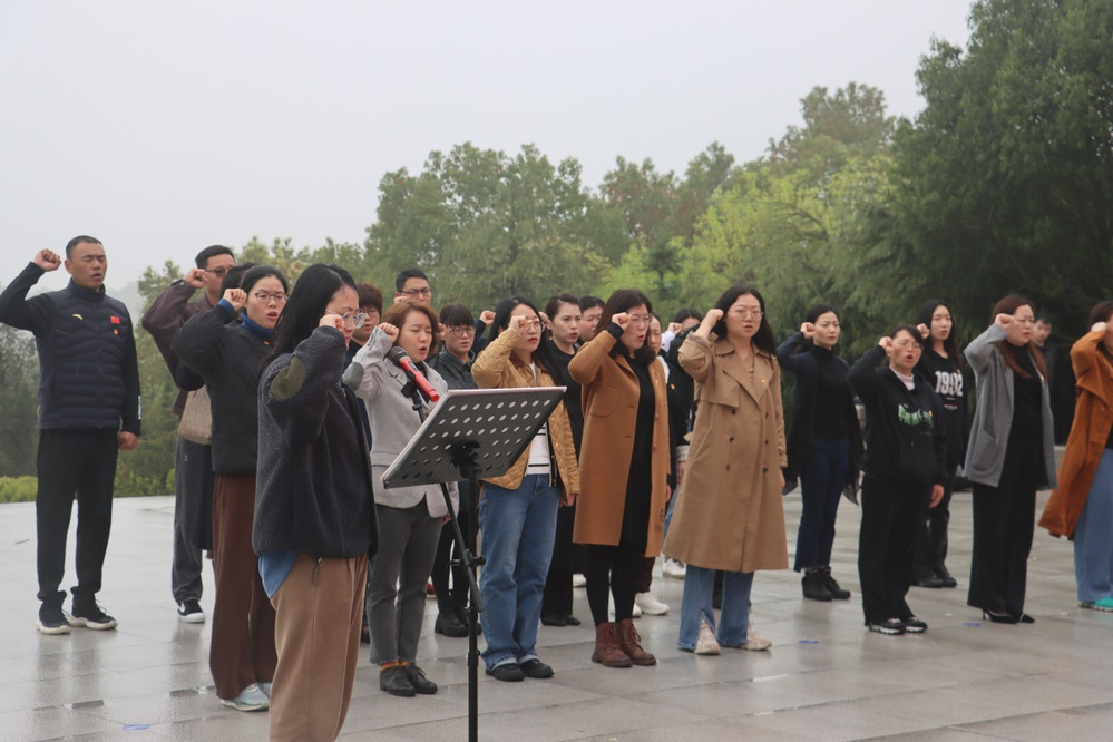 仪式伊始,两位党员代表缓缓走上前,将盛满鲜花的花篮敬献在烈士纪念碑前,学校党委委员、纪委书记姜振宇上前整理挽联。随后,在肃静的氛围中,全体人员向烈士默哀,表达对先烈的深切哀思和崇高敬意。默哀过后,重温入党和入团誓词,铿锵有力的誓言在陵园上空回荡。