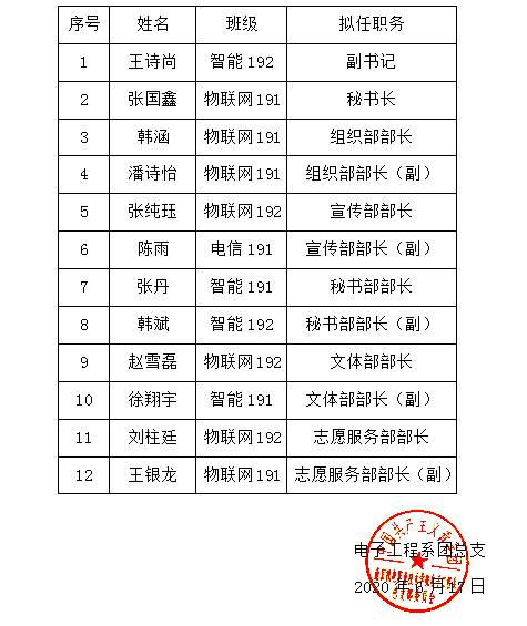 本着“公开竞聘、公平竞争、择优录取、民主集中”的原则,经过本人申请,组织评议和公开竞选,电子工程系团总支干部换届选举选拔工作已经完成,现将名单公示如下: