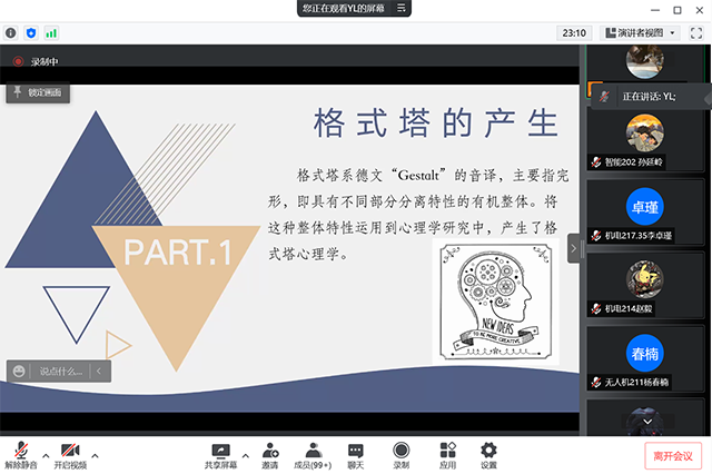 培训伊始,电子工程系刘依林老师向同学们介绍了“格式塔”名字的产生由来,随后分别深刻讲解了“格式塔心理学”的两个研究对象——“直接经验”和“行为”,通过两幅图片给予参加培训的同学们辩证的思考“你看到了什么?”加深同学们对于“格式塔心理学”研究对象的了解。接着依据社会、哲学、科学以及心理学四大背景展示了“格式塔心理学”的产生过程和变革。然后将“格式塔疗法”和“生物反馈疗法”进行对比,让同学们了解了“格式塔疗法”的九大原则。