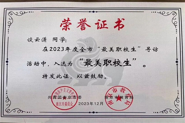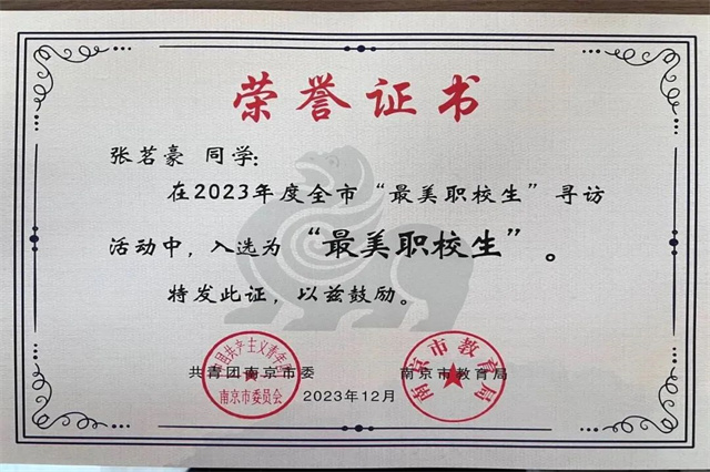 近日,由共青团江苏省委、江苏省教育厅联合举办的2023年度全省“最美职校生”寻访活动评选结果揭晓,我系张茗豪获评2023年度江苏省“最美职校生”,张茗豪、谈云潇两名同学获评2023年南京市“最美职校生”。图:朱倩 文:朱倩 审核:陈雪