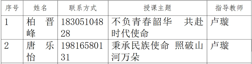 学校党委宣传部联合思想政治教育研究中心、网络思想政治工作中心举办首届大学生讲思政课比赛“思政新征程 青春勇担当”以来,电子工程系各班级依托《习近平新时代中国特色社会主义思想概论》思政课开展了积极报名和备赛,我系在5月30日进行初赛选拔活动,并评选出2名选手参加学校决赛,现将评选结果公布如下: