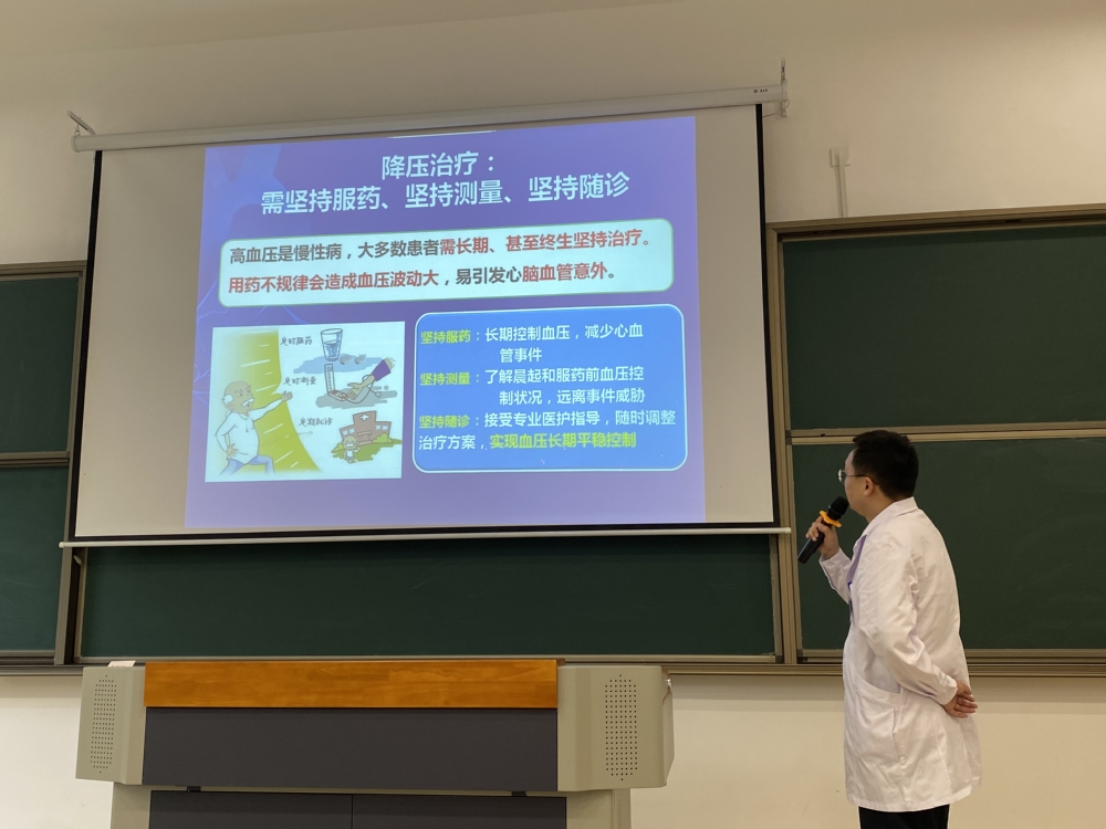 讲座中,杨小刚首先介绍了高血压的定义、危害及测量方法,强调了高血压作为心脑血管病最主要危险因素的重要性。他指出,高血压往往没有明显症状,但长期不控制会引发冠心病、心力衰竭、脑卒中等严重并发症,甚至危及生命。随后,杨小刚详细讲解了高血压的非药物治疗和药物治疗方法,包括心理平衡、戒烟限酒、适量运动、合理膳食等生活方式干预措施,以及降压药物的选择原则和使用注意事项。