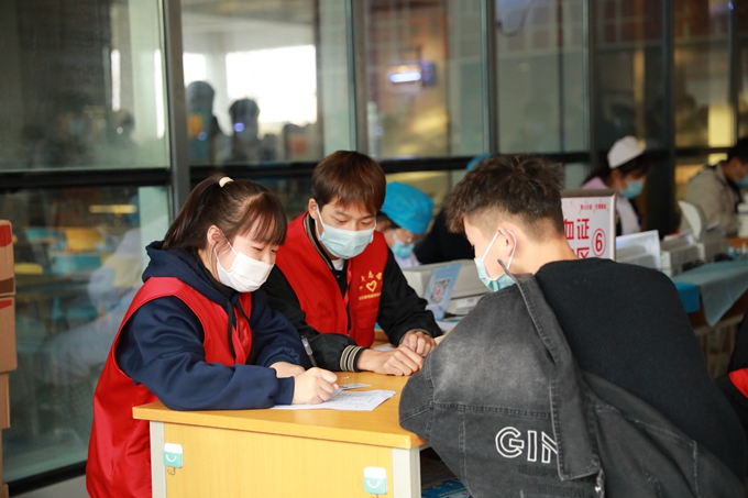 11月12日上午,在献血车到来之前,校团委的志愿者们就完成了现场的布置工作。根据疫情防控的相关要求,现场献血人员按照规定佩戴口罩、保持“一米线”。参与献血的老师和同学们按顺序填好信息、测定血型、检查身体、抽血、休息观察,在现场志愿者的帮助下,现场井然有序。