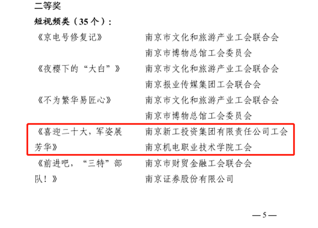 近日,南京市总工会、南京市文化和旅游局、南京广播电视集团公布了南京市首届职工短视频微电影大赛获奖情况(《关于南京市首届职工短视频微电影大赛获奖情况通报》),学校工会上报的短视频《喜迎二十大,军姿展芳华》获得短视频类二等奖。