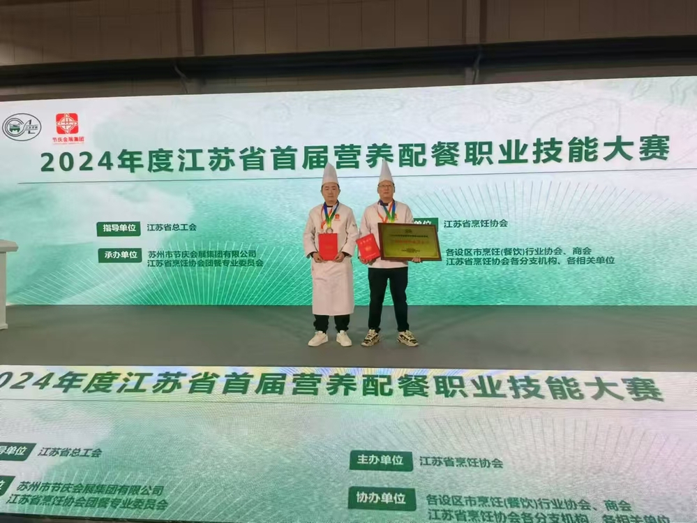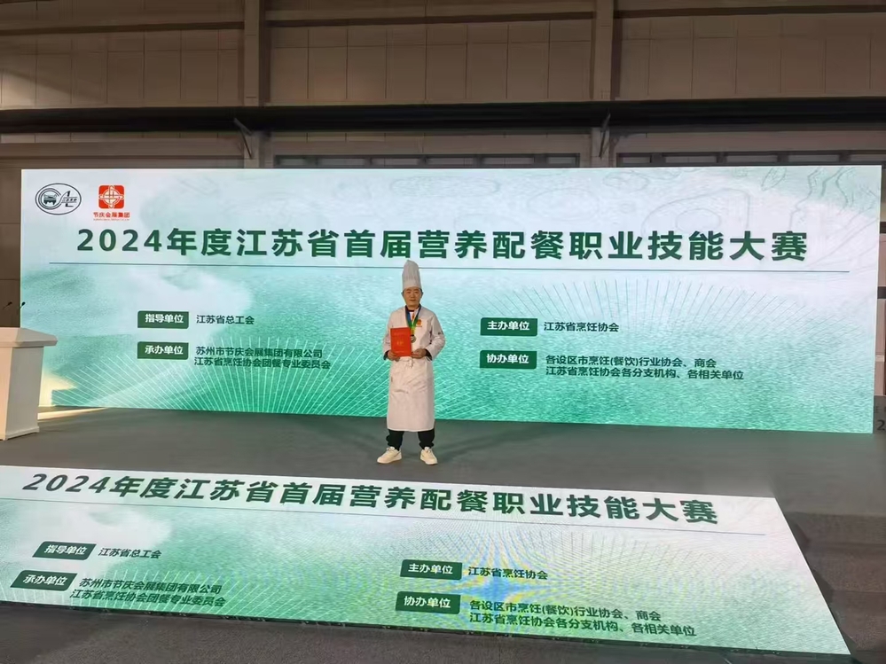 在2024年12月28日刚刚结束,由江苏省烹饪协会主办的2024年度江苏省首届营养配餐职业技能大赛中,球友会在线一楼学生食堂厨师张发旭,凭借精湛厨艺与科学营养搭配脱颖而出,斩获学生营养餐银奖、营养套餐银奖两项大奖。