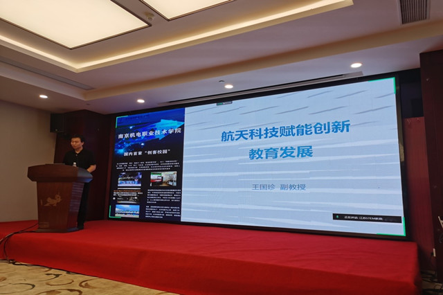 我院蓝岛创客中心主任王国珍副教授带来了《航天科技赋能创新教育发展》主题报告,分别从缘起----面向职业教育的“54333”创客教育体系、“两弹一星”到航天大国、中国航天需要什么样的人才等,到成长----科普卫星载荷研制、航天遥感技术工程师联合培养班、让南京职教的声音遨游太空、大国工匠进校园及太原号科普卫星成功发射,以及展望----航天技术创新型人才能力素质、航天产业学院等介绍学校推广航天科技为中国职业教育培养科技创新人才思路、途径和成效。