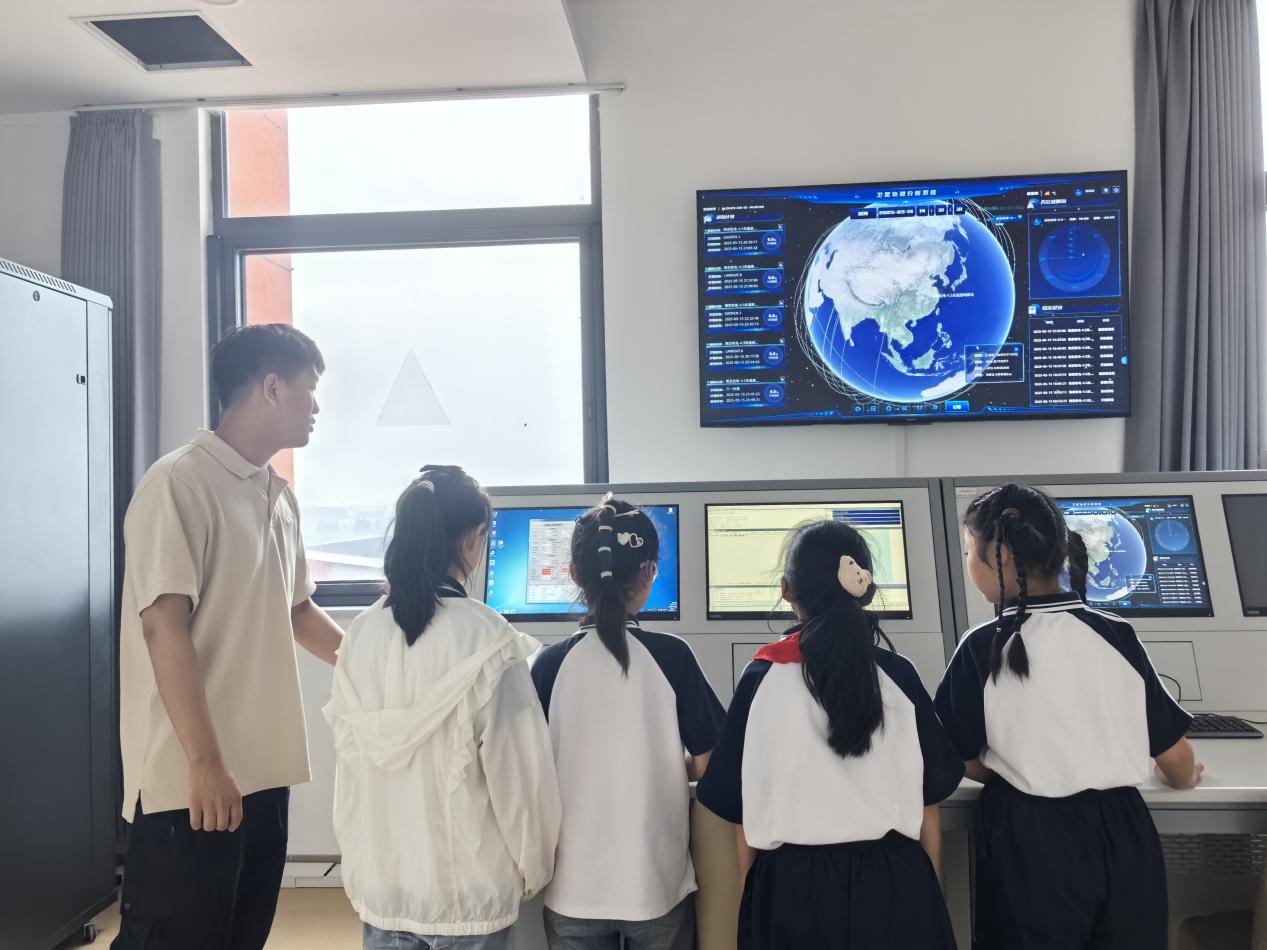 航天专业科普场馆建有全国职业院校首个“天地一体”航天科普阵地,包括航天科普馆、卫星地面接收站实验室、卫星测控中心,配套“航空航天装备智能制造技术”省级示范性虚拟仿真实训基地,创新“数字孪生+实景操作”虚实融合的科普阵地。学校卫星通信与导航技术专业负责人黄威老师,带领50余名中小学生实景操作卫星地面接收站并互动体验了卫星测控中心,孩子们无不惊叹于我国先进的航天科技。