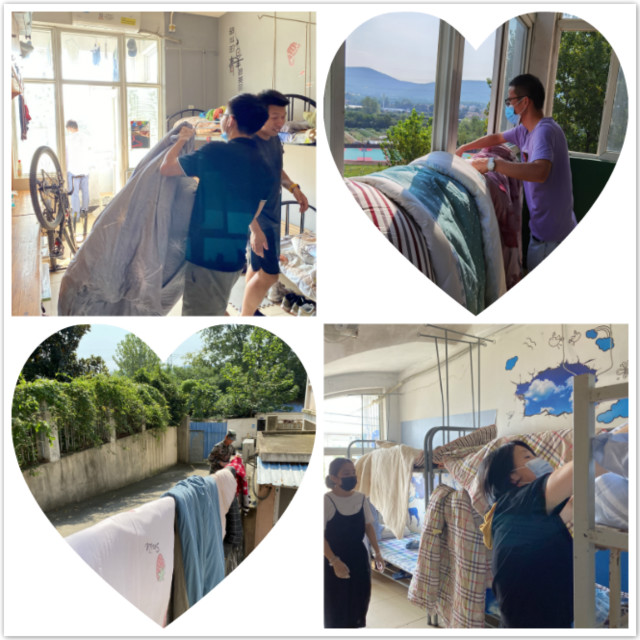 在学生宿舍楼下,机械工程系党支部副书记李杰正给全系老师们分工分组,老师们要负责将学生的被褥分批拿到空旷的地方进行晾晒,并做好标记,晒完后再放回原处,尽可能保证原样。 活动一直进行到下午3:30,系主任佟静带着老师们挨个检查完宿舍方才结束。
