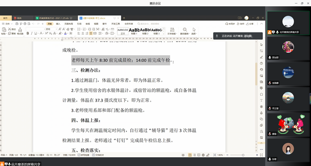为有效防控新型冠状病毒感染肺炎疫情,将危害降低到最低程度,切实保障学院师生的健康与生命安全,根据省、市教育、防疫部门相关文件精神,学院制定了球友会在线防控新冠肺炎疫情工作方案、球友会在线突发公共卫生事件应急预案以及相关制度。为了将文件精神贯彻到底,2021年9月14日下午,机械设计与制造教研室全体教师在腾讯会议平台,对学院制定的方案与制度文件进行了学习。