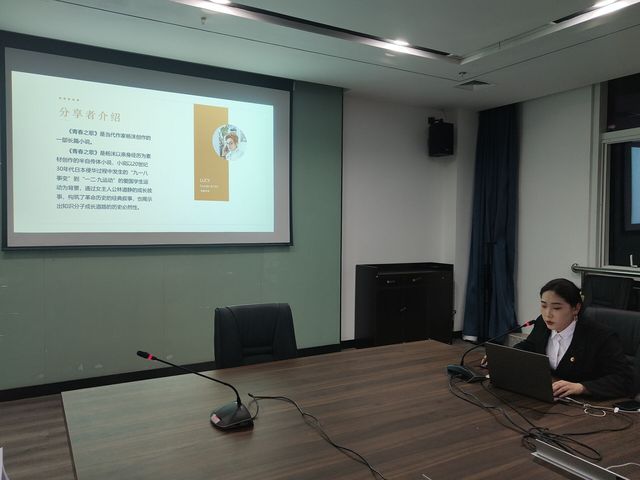 最后一位分享人是来自文体部的刘梦凡。她为我们带来了她最喜欢的一本书——《青春之歌》。刘梦凡同学分享到这是一本罕见的将目光聚焦于女性视角的小说。她向我们生动描绘了主角林道静从小资产阶级知识分子转变成长为无产阶级战士的曲折过程。最后,刘梦凡同学还拿出了自己的读书心得与大家探讨。同时她认为《青春之歌》是以成长的方式来表现革命的,其中展现的成长过程依旧值得我们青年大学生、青年团员学习和体会。