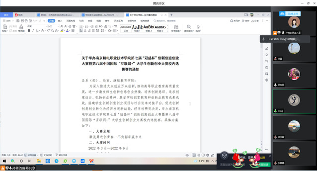 为深入推进大众创业万众创新,推动高等职业教育高质量发展,进一步激发师生创新创意创业热情,培养创新意识、追求创意设计、弘扬创业精神,展示学校创客教育和创新业教育成果成效,搭建学生创新创意创业项目与社会资本对接平台,促进创新创意创业转化为经济发展新动能,学校决定举办球友会在线第七届“冠盛杯”创新创意创业大赛暨第八届中国国际“互联网+”大学生创新创业大赛校内选拔赛。 2022年4月2日上午,机械设计与制造教研室全体老师在腾讯会议线上平台对校内选拔赛具体内容进行学习,会议由教研室负责人孙菁主持。