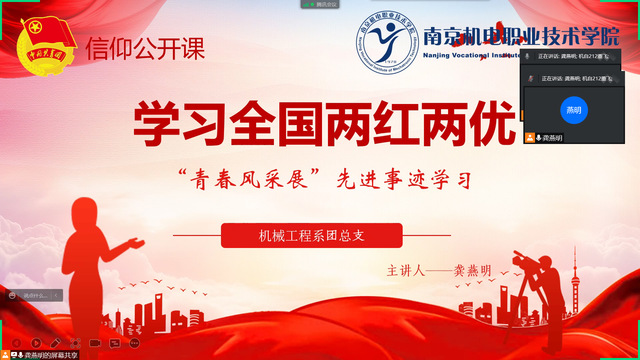 作为基层团支部,我们应学习更好的加强团组织规范化建设,严格落实“三会两制一课”等制度要求,严肃团组织生活,提升团组织的组织力、战斗力。发挥团组织职能,开展信仰公开课系列团课,组织“我是演说家”等团日活动,为团青年搭建才华展示平台。