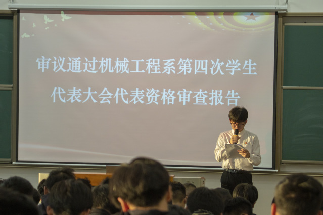 机械工程系团总支代表王可仪宣读学生代表大会贺词,机械工程系学生会主席韩田源宣读机械工程系第四次学生代表大会代表资格审查报告,机械工程系学生会副主席汤茂田宣读《球友会在线机械工程系第四次学生代表大会选举办法》,各项报告在热烈的掌声中一致通过。
