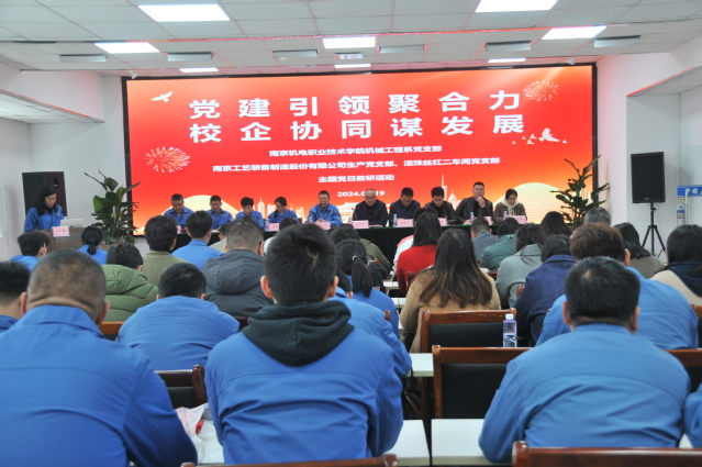 为进一步筑牢校企党建共建平台,纵深推进产学深度融合。2024年3月19日下午,学校党委副书记、副校长赵学洪带领机械工程系党支部全体教职工、学工处,与南京工艺装备制造有限公司市场综合党支部、生产党支部、技术党支部、滚珠丝杠二车间党支部在南京工艺装备制造有限公司组织开展了以“党建引领聚合力,校企协同谋发展”的党日主题教研活动。南京工艺装备制造有限公司党委书记赵如平、纪委书记刘丽丽等参加活动。