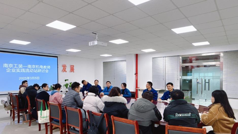 机械设计与制造专业老师赴“南京机电—工艺装备教师企业实践流动站”开展交流学习为进一步深化校企合作,强化高素质“双师型”教师队伍建设,推进教师深入企业开展实践锻炼,提升教师实践能力和创新能力,促进学校提高人才培养水平和企业科技创新能力。2025年3月5日,机械工程系主任毛奇带领“南京机电-工艺装备教师企业实践流动站”团队及2025年教学比赛团队前往南京工艺装备制造有限公司开展交流学习。南京工艺装备制造有限公司纪委书记刘丽丽、首席主任工程师王守珏、技术党支部,支部书记李小春、设备部部长彭朝胜、品管部部长魏胜利、综合管理部主管陶冶参加此次交流会。