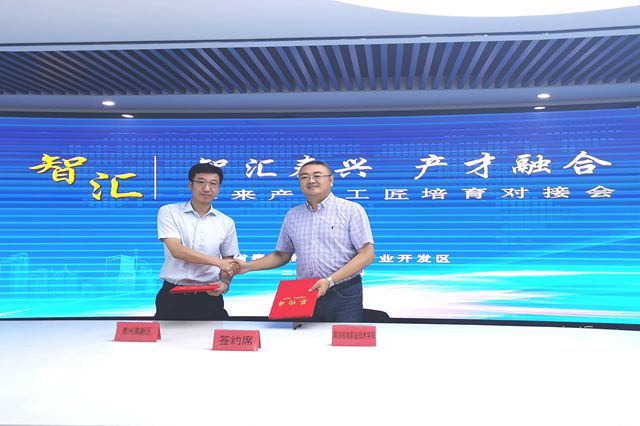 学院副院长刁爱军代表学院与江苏省泰兴高新技术产业开发区签订《产才融合战略合作协议》,学院党委书记、院长周庆礼向江苏省泰兴高新技术产业开发区授予“球友会在线未来产业工匠培育基地”铜牌。