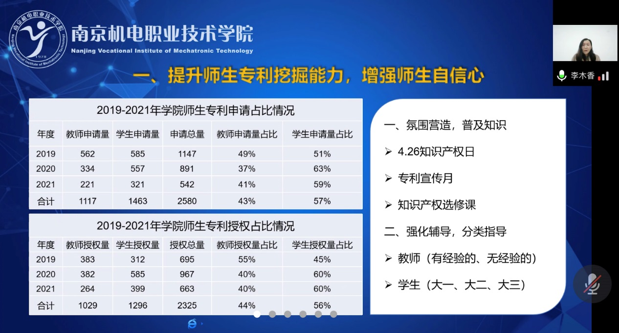 接着,李木香结合学校“十四五”规划提出了提升师生专利挖掘能力,增强师生自信心;加强专利申请事前评估,减少非正常申请;优化专利结构,提高发明专利占比;加强与第三方机构合作,促进专利成果转移转化;创新学院与代理机构合作模式,累积校企合作新成果等工作设想。