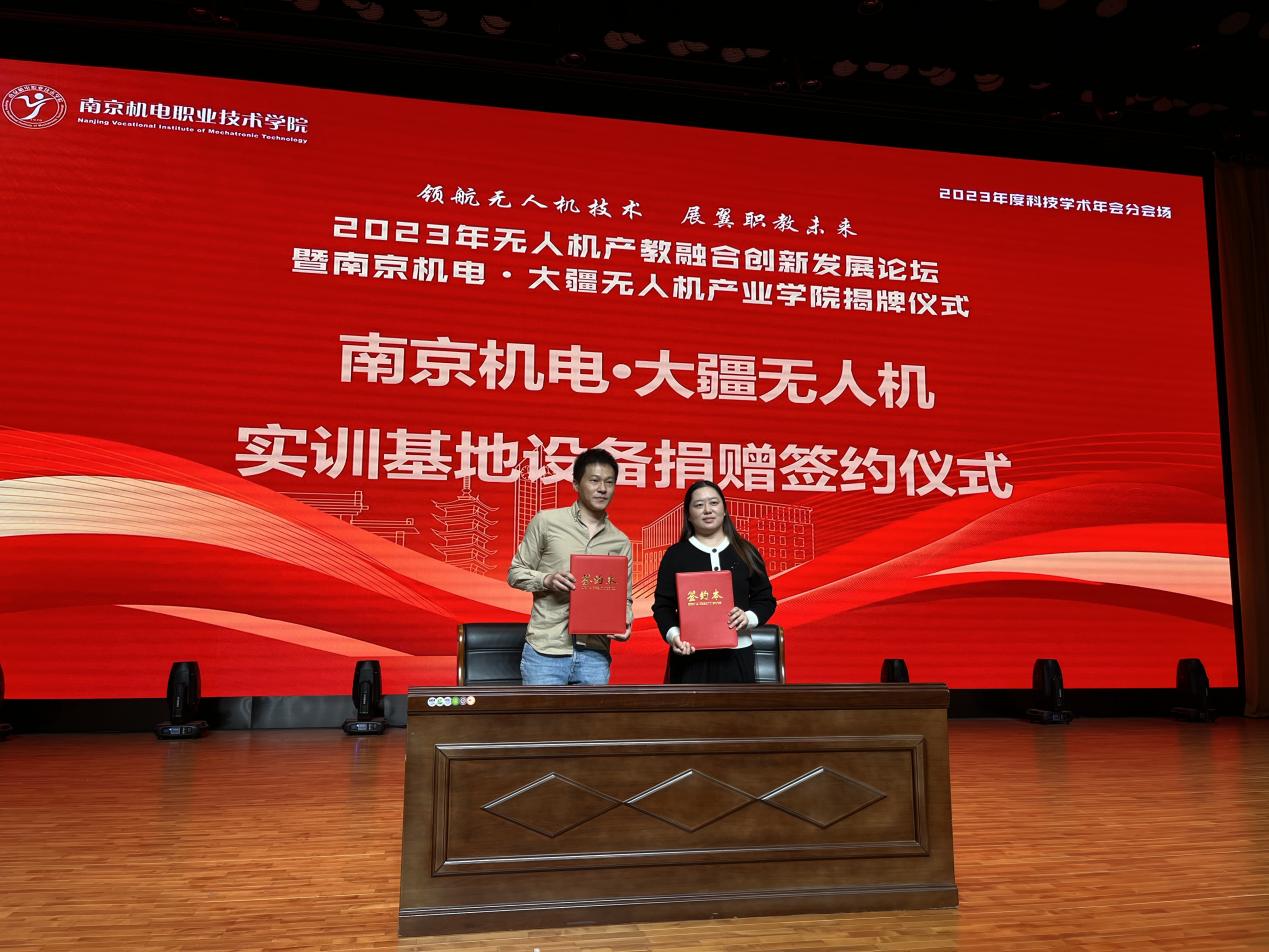 揭牌及签约仪式上,学校党委委员、副校长刁爱军与深圳市大疆创新科技有限公司华东区代表滕菲共同为“南京机电•大疆无人机产业学院”揭牌。学校电子工程系主任姚小冬与滕菲为“南京机电•大疆无人机实训基地”揭牌。学校党委委员、纪委书记、工会主席姜振宇与南京弘谷信息科技有限公司总经理赵华君共同签订“南京机电•大疆无人机实训基地设备捐赠协议”。学校电子工程系副主任丁向琴与南京弘谷信息科技有限公司副总经理顾启凌共同签订“南京机电•大疆无人机产业学院第一个合作项目协议”。学校与深圳市大疆创新科技有限公司将本着优势互补、共同发展的宗旨,坚持“育人为本、产业为要、产教融合、创新发展”的建设原则,以区域无人机产业行业发展急需为牵引,立足机电学院办学定位和发展思路,建立长期、紧密的合作关系,打造融专业人才培养、关键核心技术研究、前沿技术创新应用推广、专业师资赋能、辐射地方产业、企业孵化服务、学生创业辅导等功能于一体的无人机领域示范性人才培养实体。
