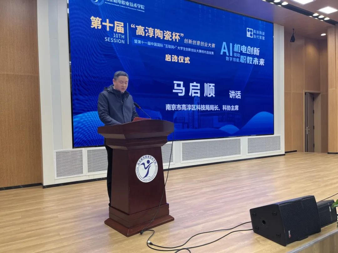 2025年3月18日,“AI驱动机电创新,数字领航职教未来”球友会在线第十届“高淳陶瓷杯”创新创意创业大赛暨第十一届中国国际“互联网+”大学生创新创业大赛校内选拔赛启动仪式在乐学楼102报告厅举行。南京市高淳区科技局局长、科协主席马启顺,南京高淳高新技术产业开发区管理办公室分管负责人倪友谊,南京高等职业教育创新创业园发展服务中心主任吴凯,江苏高淳陶瓷股份有限公司党委副书记、副总经理周玉明,学校党委委员、副校长刁爱军等领导出席启动仪式。300余名师生代表参加活动,共同见证大赛开幕。