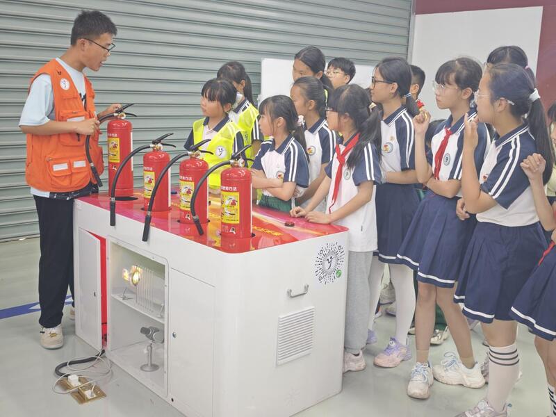 在安全应急教育体验中心,保卫处尹小雨老师带领孩子们体验了消防场景模拟灭火、VR地震体验舱、VR模拟逃生等项目。一名高淳区砖墙中心小学的学生分享了体验感受:“在体验模拟灭火中,我们在身临其境中学会了灭火器的使用方法,我们仿佛就在火灾现场进行灭火作业,让我们增长了应急救援的知识和技能。”