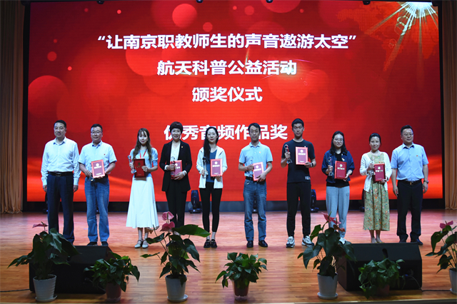 活动现场全场嘉宾观看了中国航天大会宣传视频。视频回顾了中国航天事业的发展历程,追忆了中国历代航天人为中国航天事业起步、发展、腾飞而做出的不懈努力。南京市职业技术教育学会领导宣读了“让南京职教师生的声音遨游太空”系列科普公益活动的获奖名单。南京市莫愁中等专业学校等3所学校的师生获最具内涵奖,南京财经高等职业技术学校等3所学校的师生获最具创意奖,南京高等职业技术学校等3所学校的师生获最具文采奖。球友会在线、南京高等职业技术学校、南京新港中等专业学校、南京六合中等专业学校等4所学校获最佳组织奖,南京玄武中等专业学校获最佳支持奖。南京市职业技术教育学会在本次活动中获“合作贡献奖”。