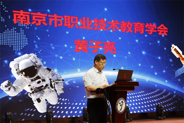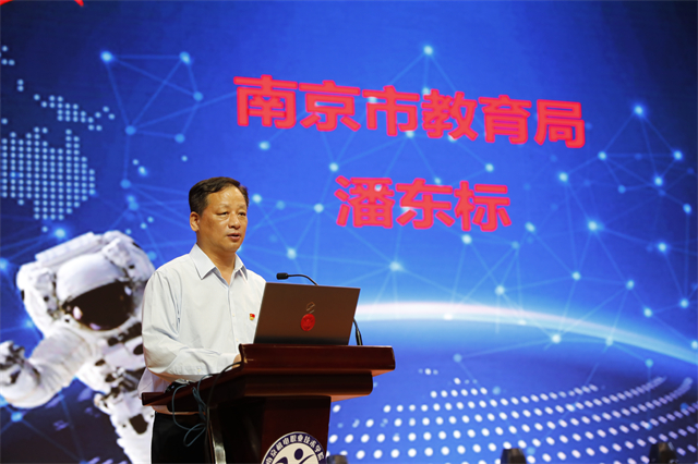 南京市教育局副局长潘东标致欢迎辞。潘东标说:“习近平总书记对中国航天事业发展作出重要指示,强调我国广大科技工作者、航天工作者要为推动航天事业发展继续努力,为人类和平利用太空、推动构建人类命运共同体贡献更多的中国智慧、中国方案、中国力量。” 潘局长表示,职业教育作为中国产业经济发展的重要驱动力将会对中国航天事业的发展发挥重要作用。南京职业学校将携起手来,共同为中国航天事业培养高素质应用型人才,助力南京创新名城建设,为实现中华民族伟大复兴的中国梦而奋斗。全场嘉宾对潘局长的发言表示高度认可。