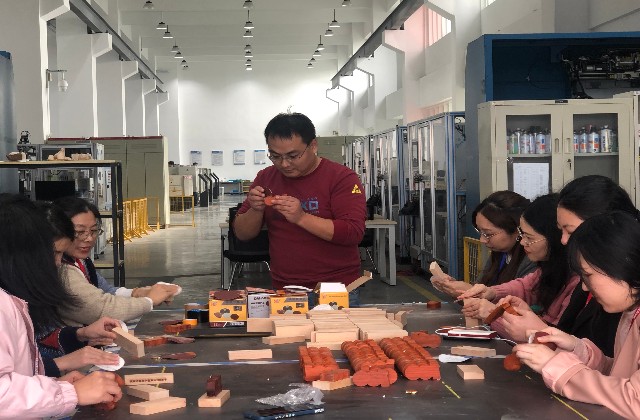 然后用抛光布在底座和主体上涂抹木蜡油进行抛光处理。在主体上用电钻安装吸铁石以便于党徽的摆放。最后,使用热熔胶粘黏主体和底座。活动中,教师们仔细打磨,耐心涂蜡抛光,一件件精美的作品在老师们的细心打磨下应运而生。