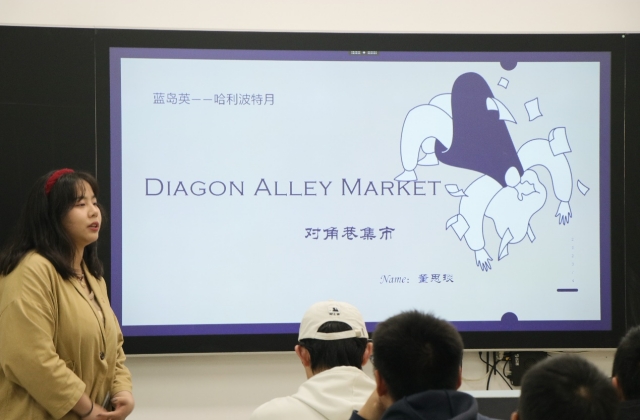 “哈利波特”主题月主策划朱泽遇同学对英语菜单进行详细讲解,并与“蓝岛英”总负责崔洪硕同学进行即兴集市买卖表演。