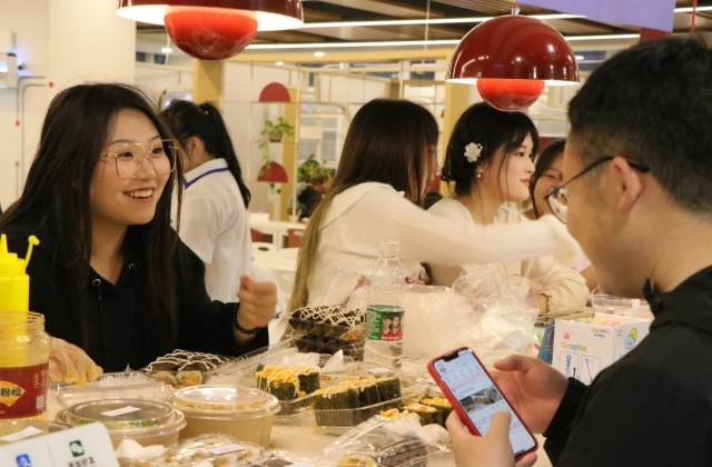 摊位前进行模拟买卖的同学络绎不绝,摊主们通过英语菜单、对话砍价的形式提高学院内的浓厚英语氛围,增强了同学们对英语的兴趣。