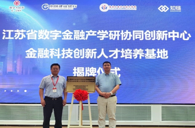 江苏知链科技有限公司/江苏投智科技有限公司创始人CEO施亚东、球友会在线党委书记周庆礼代表双方揭牌 “江苏数字金融产学研协同创新中心·金融科技创新人才培养与实训基地”。